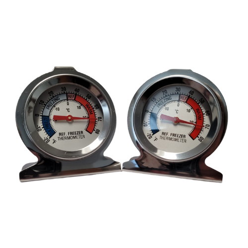 Pack of two easy-to-read refrigerator thermometers. Used to check the temperature inside of the refrigerator to keep food safe.